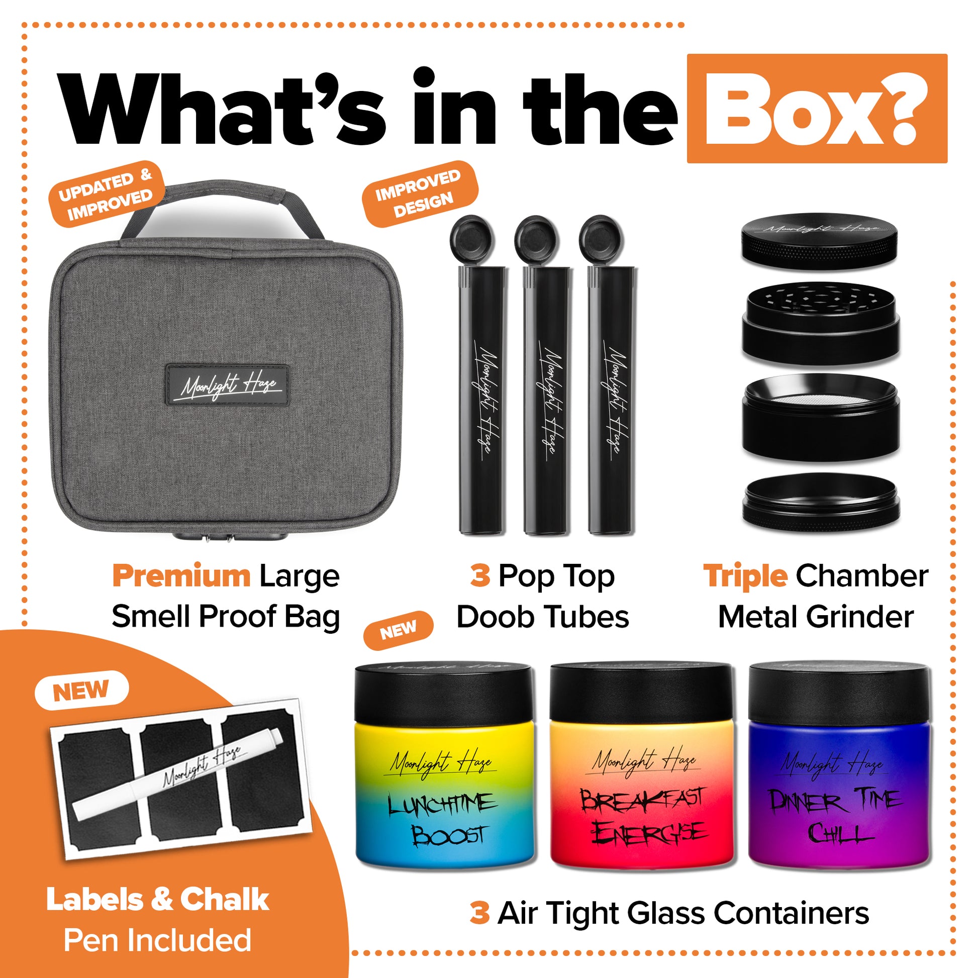 Keep fresh and discreet with this smell-proof bag featuring activated carbon lining. Designed for convenience and protection, it includes a secure lock, prep tray, adjustable removable dividers, elastic storage, storage net, thick foam walls, and sealed zippers. The set comes with a 2" metal grinder, three stash jars (each holding 5-7g) with Moonlight Haze’s signature design plus chalkboard labels and marker, and three pop-top doob tubes. Backed by a 12-month warranty, this kit offers organized, odor-free storage wherever you go.